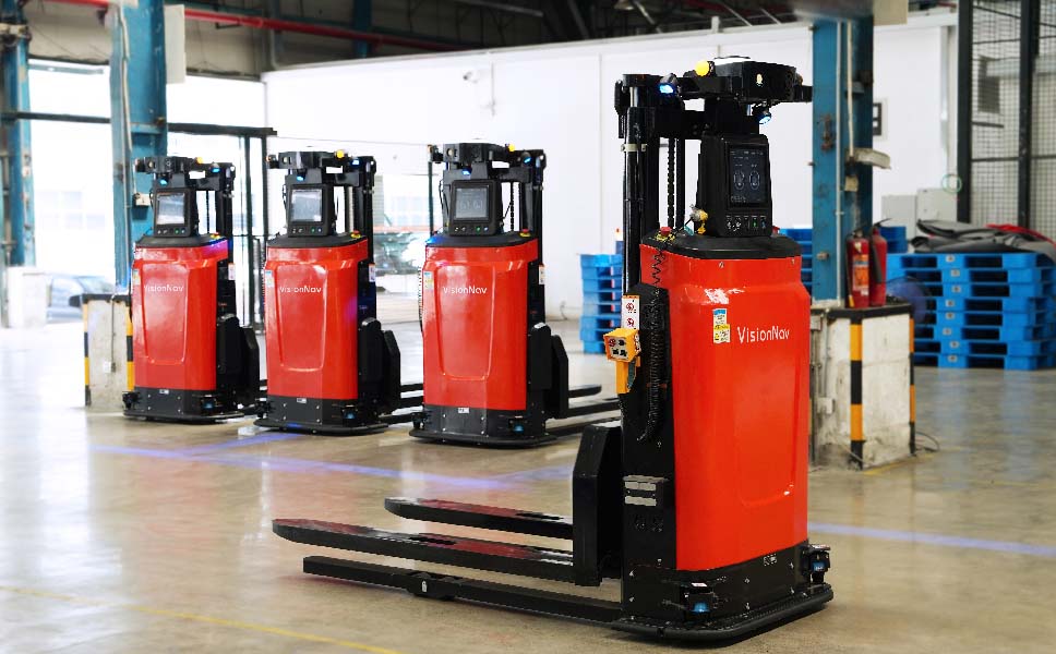 The customer has adopted VisionNav's Intralogistics automation solution with five VNSL14 Pallet Stacker AGVs. The installation is attached with the BrightEye System and Robot Control System(RCS) 2.0, autonomously enabling cargo handling for inbound and outbound operations.