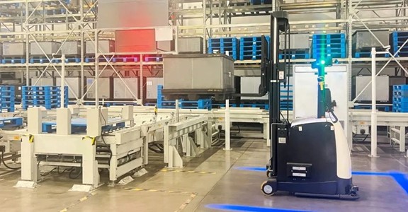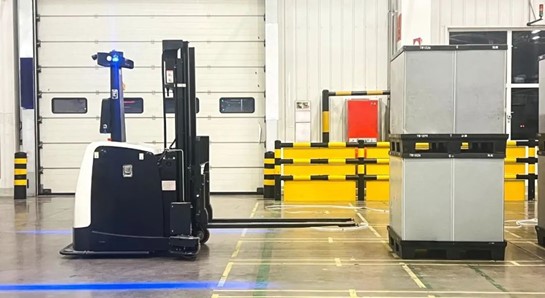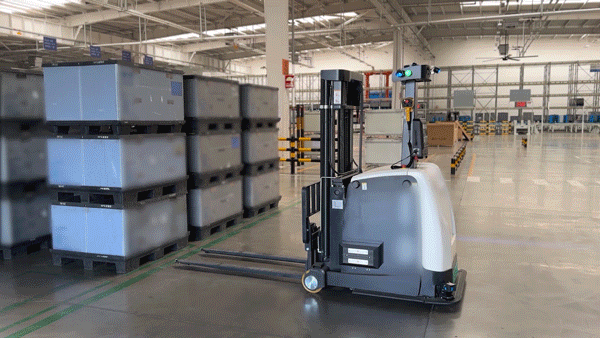 Material Feeding Process: When materials are manually moved to the temporary storage area, the intelligent monitoring system detects inventory changes and triggers a feeding task, carried out by the AMR robot. The VNP15 Autonomous Pallet Stacker is dispatched to pick up stacked boxes (three layers per stack) and transport them to the inbound buffer zone.