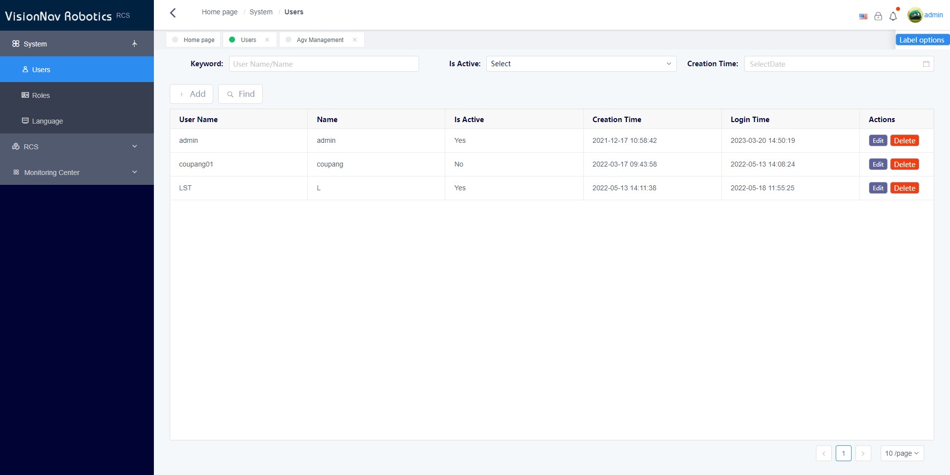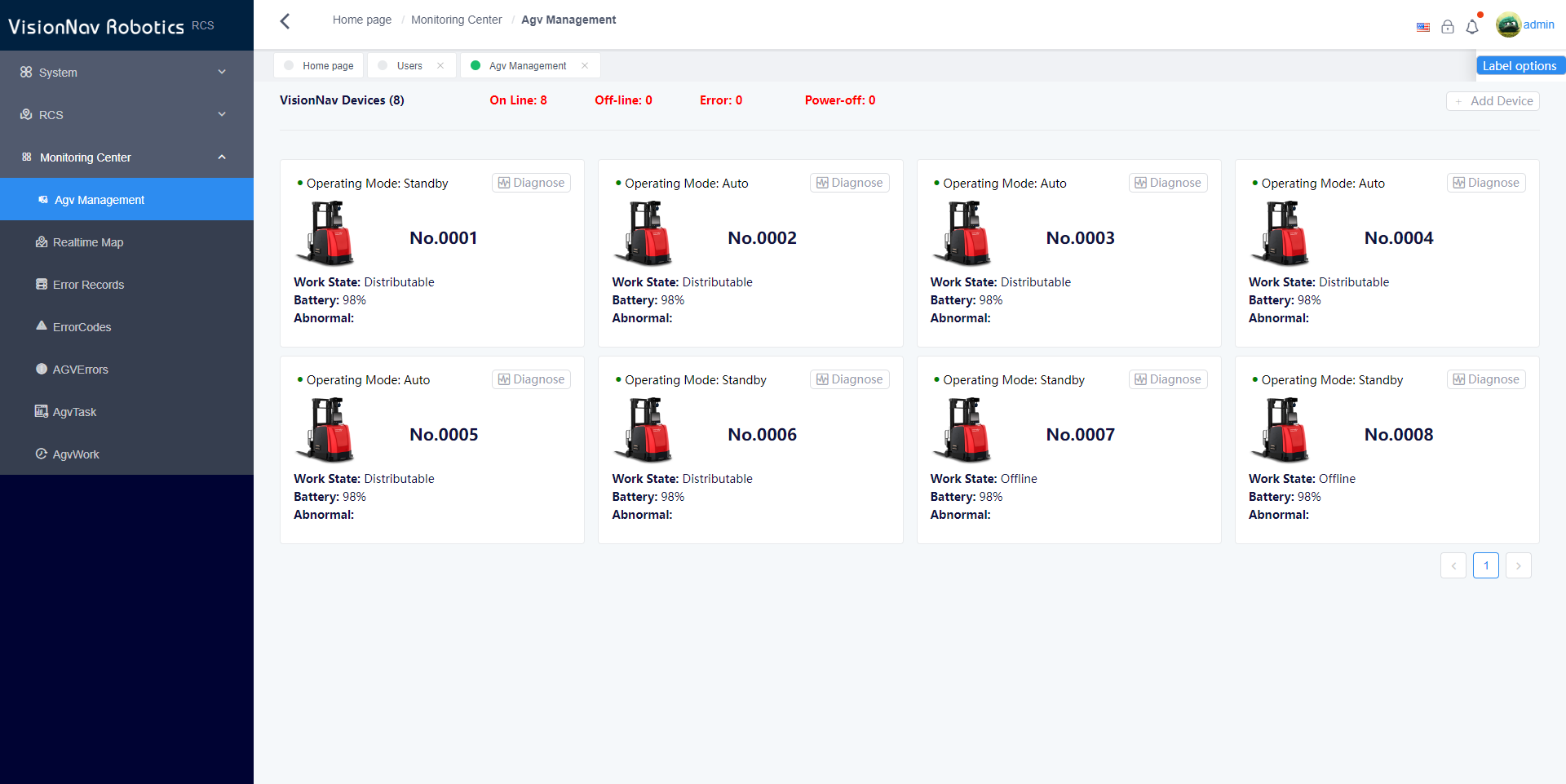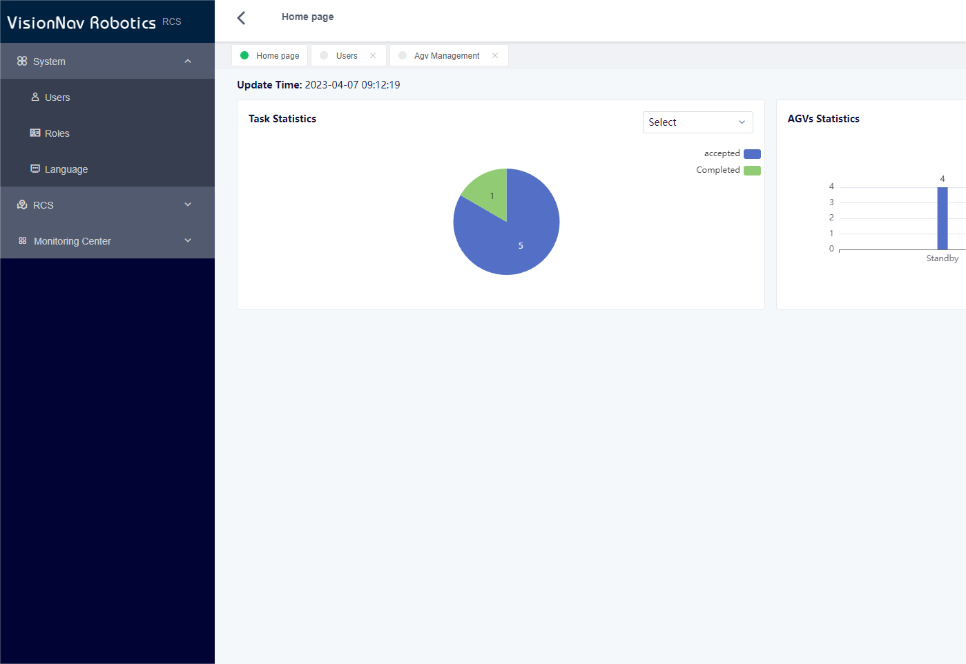 The robot control system(RCS) provides functions such as AGV management, real-time operation map, instruction management, task management, abnormal information management, etc. RCS can also support a series of information management before, during,and after the operation of AGV.