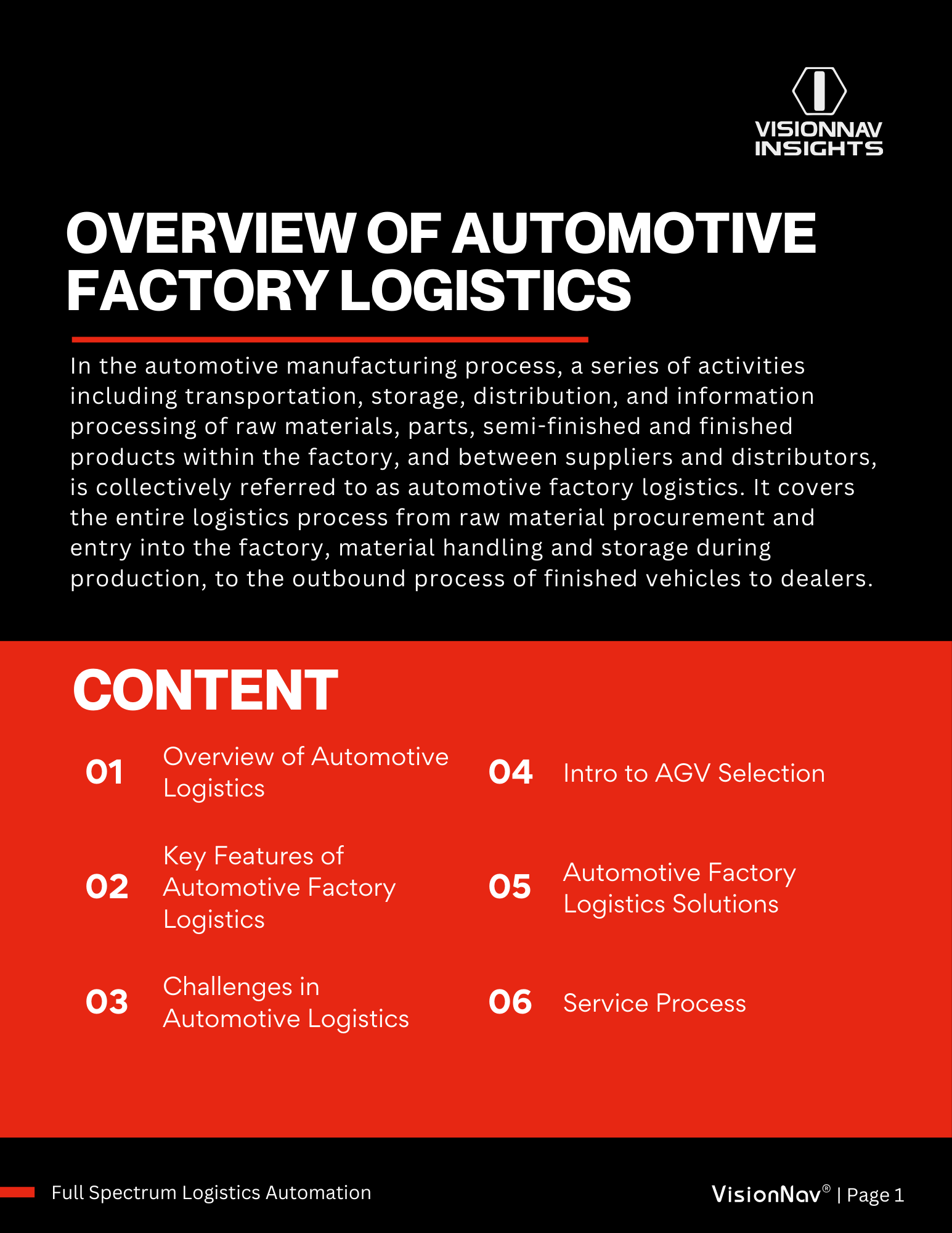 This whitepaper examines the critical role of automated logistics solutions in optimizing efficiency and productivity within automotive manufacturing plants. As the automotive industry faces rising demand, complex supply chains, and the push for digital transformation, implementing advanced AGVs and automated material handling systems has become essential. The whitepaper explores the benefits of automated logistics, including improved accuracy, reduced operational costs, and enhanced flexibility. Through real-world case studies and industry insights, it demonstrates how AGVs and robotic systems streamline internal logistics, support just-in-time production, and drive smarter, more scalable operations in automotive factories.