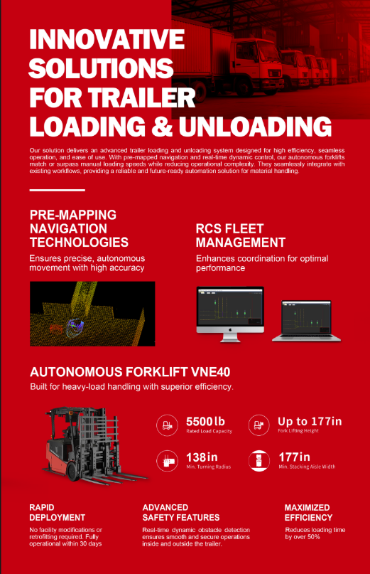 The VNE40 delivers advanced trailer loading/unloading with customizable attachments, a double-fork design for twice the efficiency, and smart onboard pre-mapping for seamless, obstacle-free navigation.