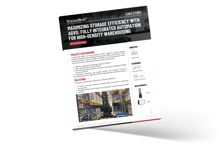 A leading logistics and warehousing provider deployed 10 VisionNav VNA15 driverless forklifts to automate pallet handling in extremely narrow aisles, achieving seamless integration with their WMS, WCS, and conveyor systems. The solution enhanced storage density, improved operational efficiency, and eliminated manual transfers between aisles.
